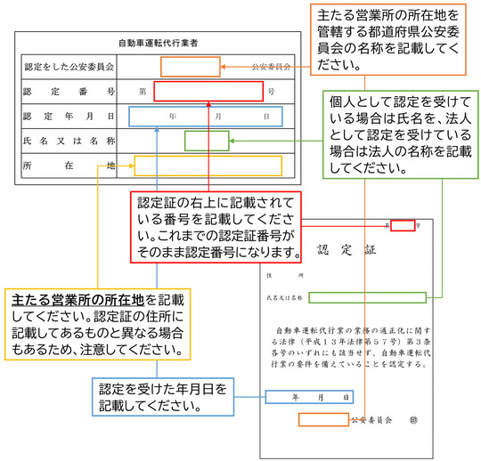 ・随伴用自動車の自動車登録番号、車両番号、標識の番号又は車台番号(これらが存しない場合の車台番号を含む)また、以下のいずれかの事由に該当したときは、その日から10日以内に、(警察署を経由して)都道府県公安委員会に対し、認定証を返納する必要があります。