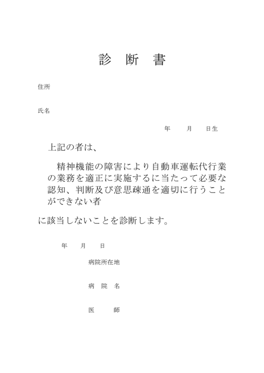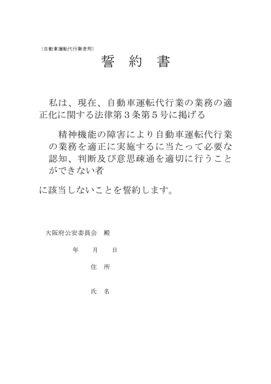 「精神機能の障害により、自動車運転代行業の業務を適正に実施するに当たって必要な認知、判断及び意思疎通を適切に行うことができない者」に該当しない者であることを誓約する書面
