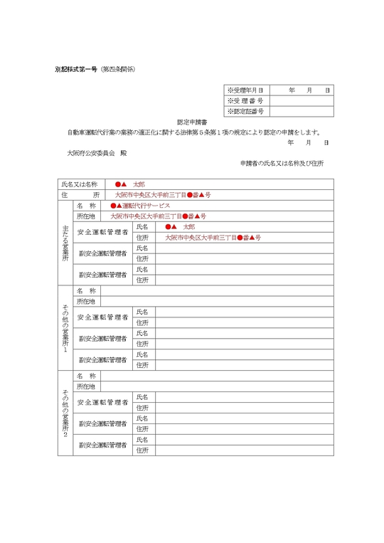 弊所が主たる営業所を管轄する警察署へ自動車運転代行業の認定申請をします。申請書類を公安委員会が審査し、国土交通大臣の同意を得た後、認定された場合は認定証が交付されます。