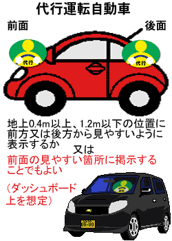 代行運転自動車を運転する場合は、車体の前後に、代行運転自動車標識を表示する必要があります。ただし、代行運転自動車の車体の材質又は状態その他の事情に照らして、代行運転自動車標識を付けることが困難又は不適当であると認めるときは、標識を代行運転自動車の前面の見やすい箇所(ダッシュボード上を想定)に掲示することをもってこれに代えることができます。