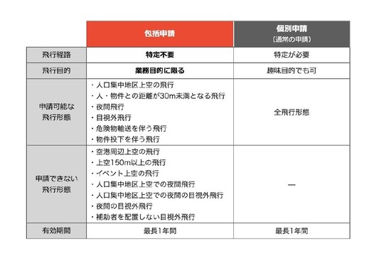 ・包括申請は、業務でドローンを継続的に使用する事業者向けです。