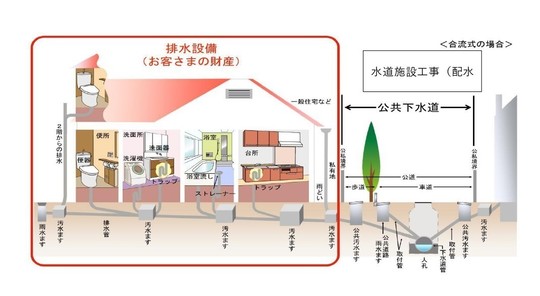 ・公共の道路や敷地内にある、各建物に水を供給したり、汚水を排出するための配管工事