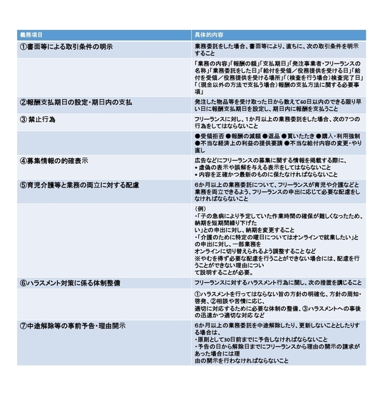 ・対象となる情報: フリーランスの仕事を探す際に、発注企業が公開する情報(仕事の内容、場所、期間、報酬、契約の解除条件など)は、正確で最新のものでなければなりません。