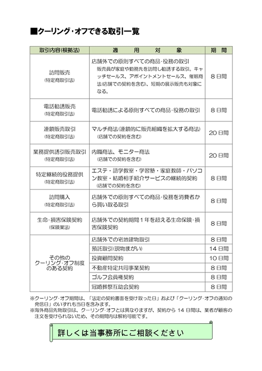 法律で対象とされている取引きは「クーリング・オフ」ができる取引一覧を参照してください。ただし、適用除外商品・サービスもあります(⑧参照)