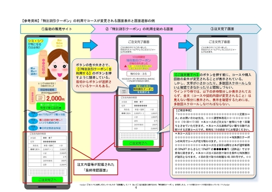 このように購入回数の条件がない定期コースを申し込んだ後に、「特別割引クーポン」を使用したことで、消費者が気づかないうちに、購入回数の条件がある定期コースに変更されてしまうケースがあります。「最終確認画面」の文字が小さかったり、多数回スクロールしないと確認できなかったりと、消費者が認識しずらいことも原因と考えられます。