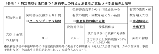 特定商取引法に基づく脱毛エステの中途解約は、サービス提供後の解約であった場合「すでに提供されたサービスの対価」と「2万円を上限とする損害賠償額」が請求されることになります(参考1)。 この「すでに提供されたサービスの対価」は有償提供部分にかかる期間・回数が対象となりますので、 原則、無償提供部分には発生しないものとされています。したがって「中途解約はできない」「返金はない」などと言われた事例の多くは事業者が設定した 有償の期間または回数のいずれかが終了した後に中途解約を申し出たケースでトラブルになってい ます(事例2~4)。