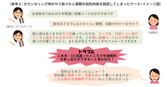 例えば、カウンセリング時に「2年、24回程度通えばキレイになる」と説明されたにも関わらず、実際の契約内容を確認すると、有償期間が2年未満であったり、施術回数が24回未満であったりする場合があります。また、「7回程度受けて効果を感じなかったので中途解約を申し出たところ、18回目くらいから効果がみられる」と言われ、契約残額を全額支払うよう求められたというケースもみられます(事例4)。