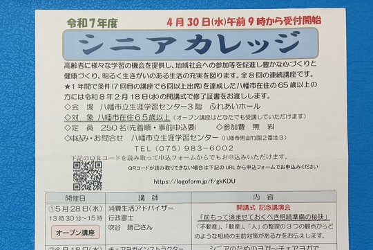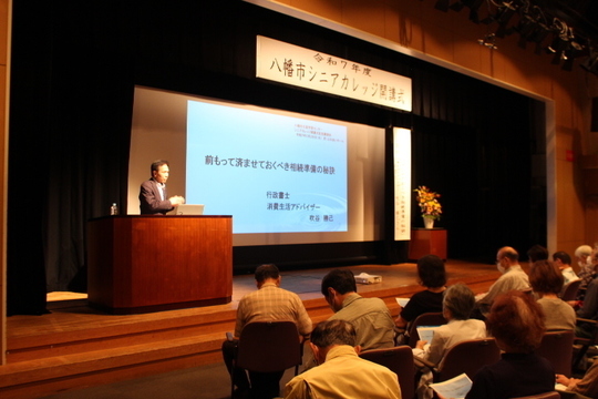 5月28日 京都府八幡市生涯学習センターにおいて、シニアカレッジ開講式記念講演会に登壇しました。220名応募いただき当日170名の多数のご参加いただきありがとうございました。講演会終了後も多数の市民の方からご相談いただきました。