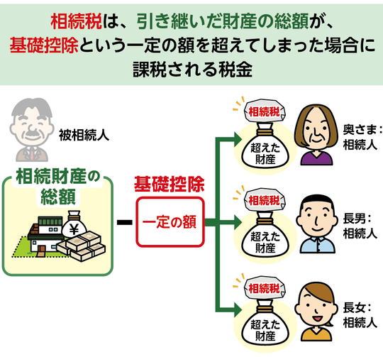 相続税とは、亡くなられた方(=被相続人)の財産を引き継いだ際に、その財産の総額が基礎控除額を超える場合に課される税金です。