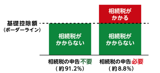国税庁の「相続税の申告状況(令和2年度分)」によると、相続税の課税対象となった相続件数は全体の約8.8%に過ぎません。つまり、約91.2%の相続では相続税が発生していません。