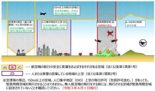 なお空港周辺、150m以上の空域、DID上空等の飛行許可があっても、緊急用務空域の飛行はすることはできません。