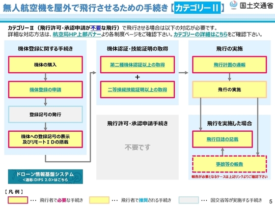また、特定飛行のうち上記の場合以外(DID上空、夜間、目視外、人又は物件から30mの距離を取らない飛行であって、飛行させる無人航空機の最大離陸重量が25kg未満の場合)については、立入管理措置を講じた上で、無人航空機操縦士の技能証明を受けた者が機体認証を受けた無人航空機を飛行させる場合、飛行マニュアルの作成等無人航空機の飛行の安全を確保するために必要な措置を講じることにより、許可・承認を不要とすることができます(カテゴリーⅡ [飛行許可・承認申請が不要な飛行])。