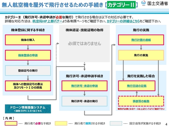特定飛行のうち空港等周辺、150m以上の上空、催し場所上空、危険物輸送及び物件投下に係る飛行並びに最大離陸重量25kg以上の無人航空機の飛行(カテゴリーⅡ [飛行許可・承認申請が必要な飛行])については、立入管理措置を講じた上で、無人航空機操縦士の技能証明や機体認証の有無を問わず、個別に許可・承認を受ける必要があります。