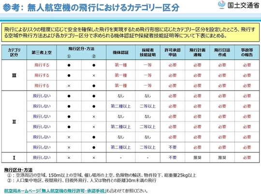 レベル4飛行(有人地帯における補助者なし目視外飛行)を含むカテゴリーⅢ飛行は、一等無人航空機操縦士の技能証明を受けた者が第一種機体認証を受けた無人航空機を飛行させる場合であって、飛行の形態に応じたリスク評価結果に基づく飛行マニュアルの作成を含め、運航の管理が適切に行われていることを確認して許可・承認を受けた場合に限ります。