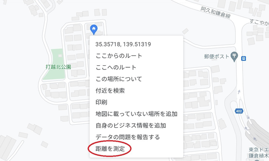 3、自宅の位置で右クリック(ここが始点)すると下の図のようになりますので、一番下の「距離を測定」をクリック。