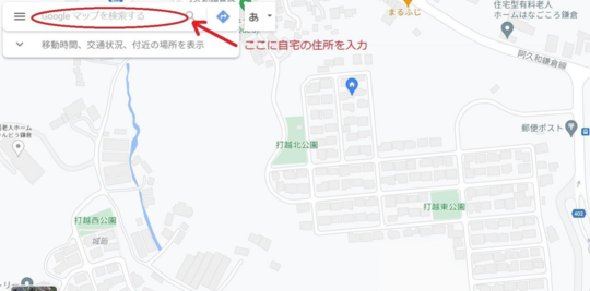 1.Googleマップを開いて自宅(使用の本拠)の住所を入力する